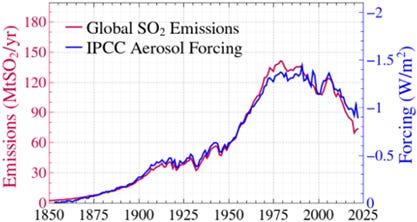 Upon noticing the excellent collegiality of 2026 projections (Fig. 2, right side), we wondered about the basis of the collegiality and if it provides opportunity to test the physics behind global warming acceleration. As explained in Sophie’s Planet,[10] IPCC’s GCM-dominated process of climate assessment leads to a low best-estimate of climate sensitivity (3°C for doubled CO2) and little role for aerosols in the steady, rapid, global warming that began about 1970 (GCM = global climate model; IPCC = Intergovernmental Panel on Climate Change). In contrast, from four independent evaluations,[11] we find climate sensitivity of at least ~4°C for doubled CO2. That high sensitivity is consistent with observed global warming of 0.18°C/decade after 1970, if aerosol cooling increased moderately during 1970-2005, as aerosol-cloud modeling suggests.[12]