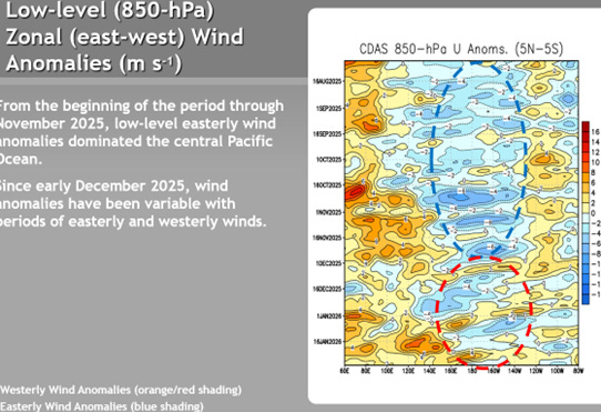 Fig. 11. Equatorial wind anomalies; westerlies (orange-red) have been dominant in the past month.[14]