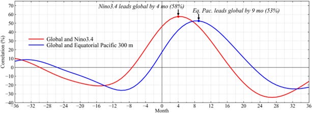 Fig. 6. Correlation of global temperature with Nino3.4 and equatorial upper 300 m temperature.