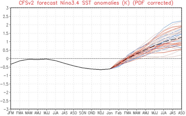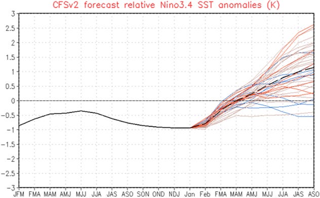 Fig. 4. NCEP Nino3.4 forecasts issued 26 January (above) and 2 February (below).[4]