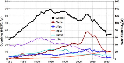 Fig. 10 shows quantities relevant to the major forcings, greenhouse gases and aerosols. The greenhouse forcing increased by about 20% between 2010 and 2015, with the main increase slightly closer to 2015. Aerosol forcing change is difficult to estimate from only global sulfate emissions, mainly because of the nonlinearity issue, but the major turning point seems to be between 2010 and 2015. Higher temporal resolution in the second graph of sulfate emissions shows that Chinese emissions declined most rapidly between 2013 and 2014. Ship emissions declined most in 2020. The final graph in Fig. 10, change of solar radiation absorbed by Earth provides a valuable overview: its change must result mainly from aerosol forcing (reduced aerosol amount) and feedbacks (mainly reduced cloud albedo, but also reduced sea ice). The change of absorbed solar energy begins between 2010 and 2015, but mostly about 2015.