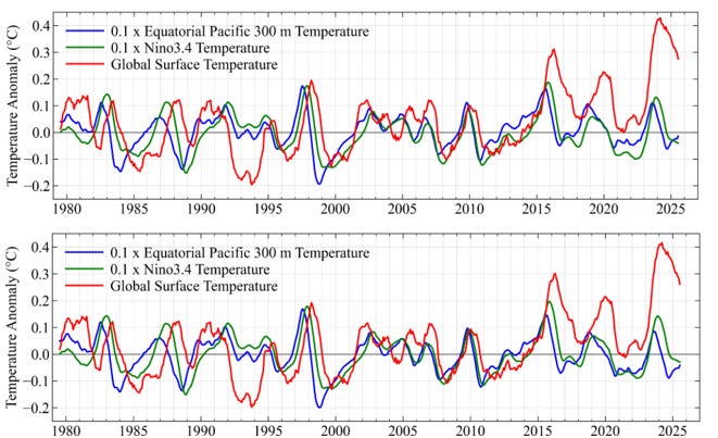 Another merit of upper ocean heat: it provides a longer lead time. The 12-month running-mean of tropical Pacific upper ocean heat has correlation of >50% with running-mean global temperature, leading global temperature by 9 months (Fig. 6). Nino3.4 has slightly higher correlation, but a lead time of only 4 months. At the end of December, Nino3.4 was still at a minimum, while the upper ocean heat anomaly climbed to zero. If this index continues to rise, it suggests an El Nino peaking near the end of 2026. Fig. 7 provides an update of both indices into 2026. Nino3.4 is still deep in La Nina conditions but the upper ocean temperature anomaly is +0.7°C. If this continues to rise, a significant El Nino becomes more likely, but there are many instances in which the 300 m anomaly reached 1°C without achieving an El Nino (Fig. 5).