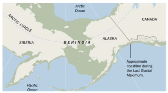 Lower sea level exposed the continental shelf around Alaska, creating a vast land area – dubbed “Beringia” – encompassing a land bridge between Asia and North America (Fig. 1.3). Humans from Siberia, who were adapted to living in cold climates, moved into Beringia. The land had shrub vegetation, trees, and large animals, which provided the Beringians with fuel and food. Archeology and genetics imply that Beringians were isolated for several thousand years, but, as ice melted, they moved freely. These Native Americans, the founding people of North, Central and South America,[8] occupied the Americas throughout the Holocene, the past 11,700 years.[III]