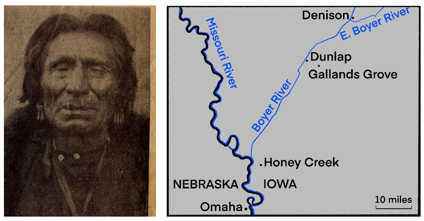 The most reliable account of Yellow Smoke’s demise, in my opinion, was passed from Ingvert and his oldest son to my parents’ generation. Sparsely settled western Iowa changed rapidly in the second half of the 1860s when a railroad was built across the state, reaching Council Bluffs in the fall of 1866. The town of Dunlap sprang into existence in 1867 on the Boyer River four miles west of Gallands Grove, after the town was platted by the railroad company. The second building constructed in Dunlap was a saloon named Respectable Place[4]. Chief Yellow Smoke took a liking to gambling and drinking with white men in Dunlap. According to my ancestors, Yellow Smoke demanded his winnings from a card game, the winnings being 75 cents (about $15 today). In an argument and scuffle that ensued, Yellow Smoke was struck on the head. The blow crushed his skull. Yellow Smoke managed to reach the Gallands Grove area, where the Omaha Tribe was encamped, but he died several days later and was buried in Gallands Grove.