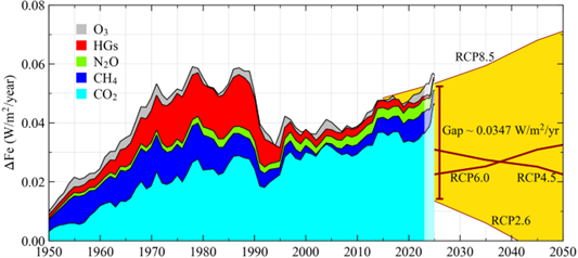 [2] IPCC defines a forcing, ERF, that excludes the second term of Equation (3) in our Pipeline paper (the next reference, below), which thus yields forcings that average several percent smaller than our effective forcings, Fe. When that second term is included, the IPCC total GHG forcing is in close agreement with ours; for some individual gases there are differences of several percent. Comparisons are included in the Pipeline paper. For updates of ozone forcing beyond the IPCC AR6 report and minor HGs that are not reported by NOAA, we use annual reports of P.M. Forster et al., Indicators of Global Climate Change 2024: annual update of key indicators of the state of the climate system and human influence Earth Syst. Sci. Data 17 (2025): 2641–80 DOI: https://essd.copernicus.org/articles/17/2641/2025/